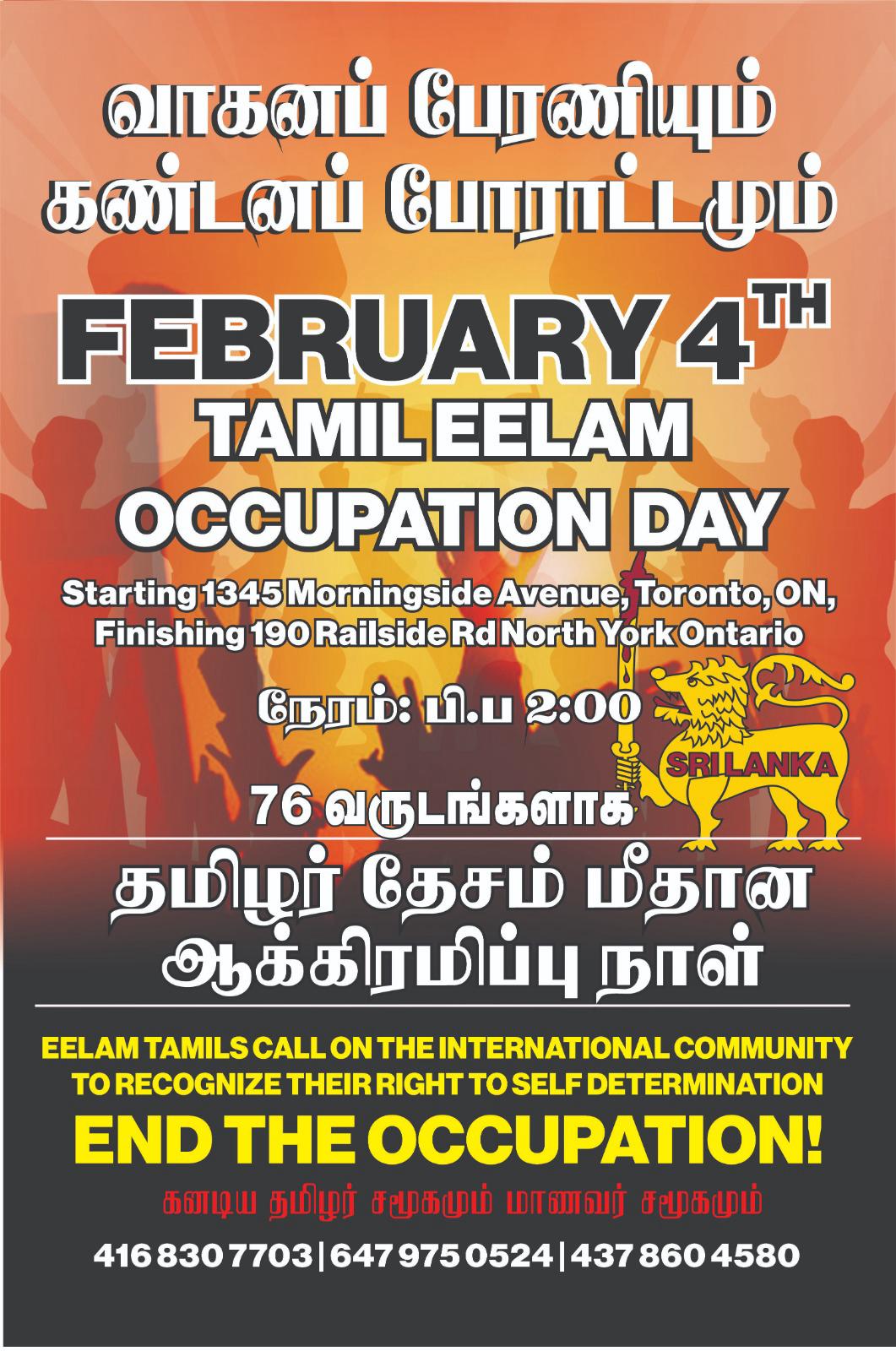 76ஆண்டுகளாக தொடர்ச்சியாக இடம் பெற்றுவரும் இன அழிப்பிற்கு சர்வதேசத்திடம் நீதி கேட்டும், பாதிக்கப்பட்ட எம் மக்களை நினைவு கூர்ந்தும், இமாலயப்பிரகடனத்தை நிராகரித்தும், சிறிலங்கா துணைத்தூதரகத்தால் முன்னெடுக்கப்படும் சிறலங்கா சுதந்திர தினக் கொண்டாட்டத்தை எதிர்த்து “மாபெரும் வாகன ஊர்தி முற்றுகைப்போராட்டம்” நடைபெறவுள்ளது.