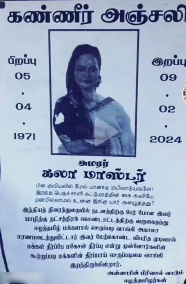 யாழ்ப்பாணம் - வடமராட்சியின் சில பகுதிகளில் தென்னிந்தியாவைச் சேர்ந்த கலா மாஸ்டருக்கு கண்ணீர் அஞ்சலி துண்டுப்பிரசுரங்கள் ஒட்டப்பட்டுள்ளமை பரபரப்பை ஏற்படுத்தியுள்ளது.