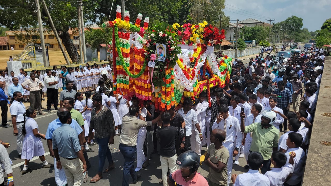 சக மாணவர்கள் அன்னாரது உடலை தோளில் சுமந்துகொண்டு சென்றிருந்தமை குறிப்பிடத்தக்கது.