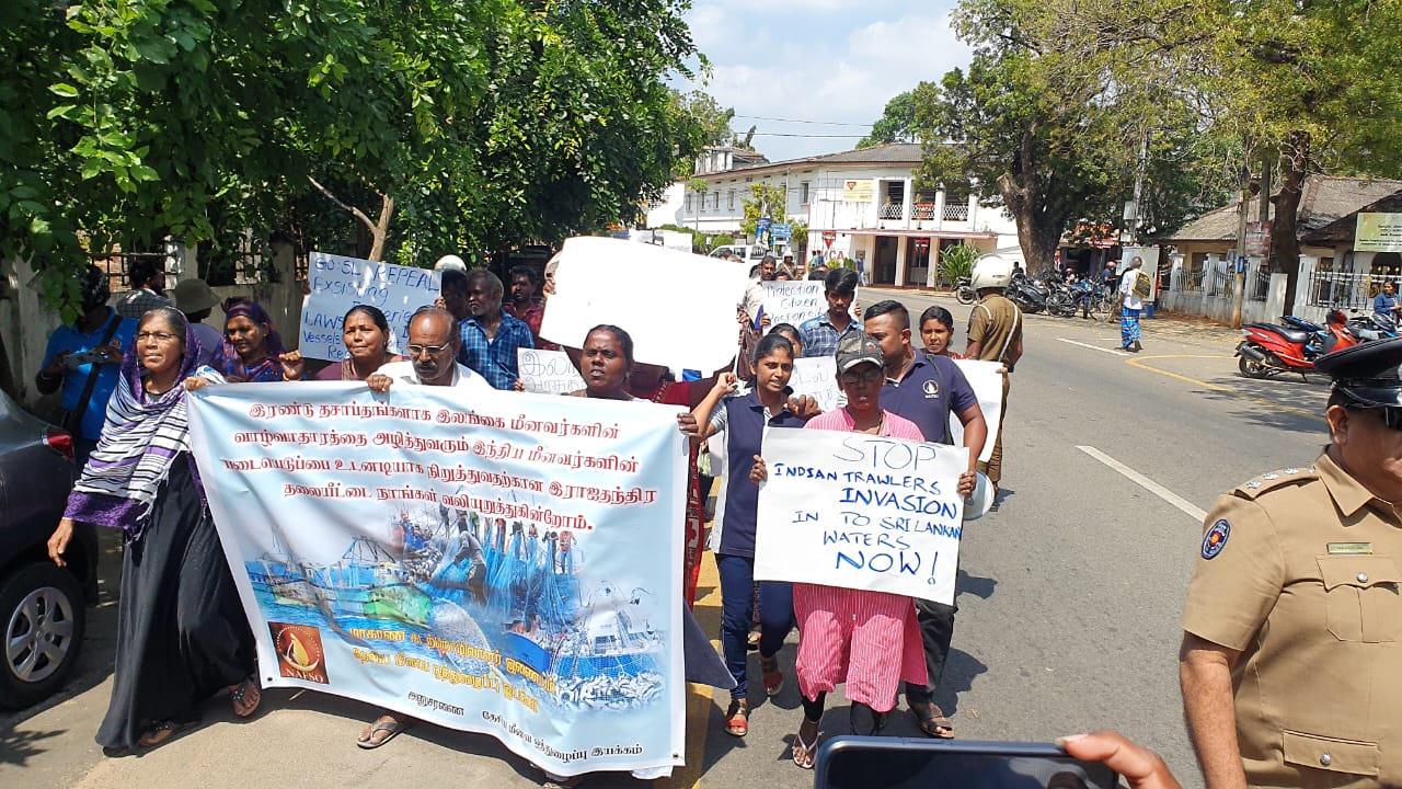 இந் நிலையில் பொலிஸாரால் இடைமறிக்கப்பட்ட போராட்டகார்ர்கள், "இலங்கை மீனவர்களின் கடல் வளத்தை அழிக்காதே, தமிழக மீனவர்களின் அத்துமீறலை தடுத்து நிறுத்து, மீனவர்களின் வாழ்வாதாரத்தை அழிக்காதே" உள்ளிட்ட பல்வேறு வாசகங்கள் எழுதப்பட்ட பதாகைகளைத் தாங்கியவாறு இலங்கை இந்திய அரசுகளுக்கு எதிராக கோசங்களை எழுப்பியவாறு போராட்டத்தில் ஈடுபட்டிருந்தனர்.